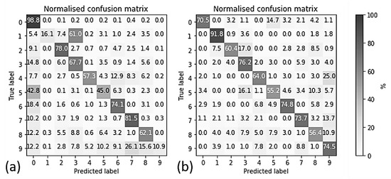 Normalized confusion matrices showing the classification results for the case that the drifting wavelength is: (a) not part of the training set and; (b) is included in the drifting wavelengths for which the VGG classifier is trained.