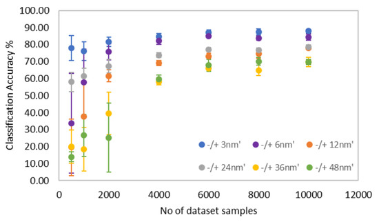 Once crucial parameter usually suggested for improving the performance of the DNNs is the number of available samples in the dataset. At the same time, this parameter is considered to be one of the drawbacks of deep learning, because there are cases for which the number of available data is limited. In order to assess whether the dataset used to train the VGG classifier in the case of wavelength drifting is sufficiently large, we investigate the classification accuracy for training datasets of different sizes. The dataset of 10,000 speckle images is shuffled in a random way and each time only a part of the total dataset is used for training and testing the DNN. The classification results are presented in Figure 7. The classification accuracy is observed to vary with the size of the training dataset. It is apparent from the values reported in Figure 7 that the more severe the wavelength drift, the more samples are needed for achieving higher classification accuracies. Nevertheless, for all the tested wavelength bandwidths, a saturation of the classification improvement is observed while increasing the size of the dataset; for the largest bandwidth (96 nm), this happens at about 6000 samples, as suggested by Figure 7. Interestingly, the accuracies measured for each bandwidth saturate at values of total available samples that are below 10,000, which implies that an increase in the dataset size would not significantly improve the results.