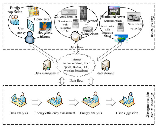 As shown in Figure 1, the energy efficiency assessment framework for residential users is divided into two modules: data acquisition and energy efficiency service application. Energy service enterprises need to conduct surveys to collect basic household information, including information on permanent household residents, household income, and housing area. Smart meters with NILM technology are used to obtain energy consumption information, and this information is bidirectionally uploaded to a data center for data storage and management through internet, optical fiber, 4G or 5G, power line communication (PLC), or wireless broadband. The energy consumption and user information are evaluated through an energy efficiency service application so as to generate energy recommendations for the user. The system is mainly intended for power companies or power selling companies. Power companies can adjust the power sales strategy according to the results.