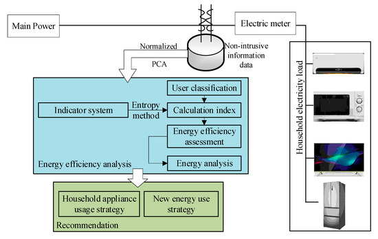 Some scholars have studied the assessment of energy efficiency and made fruitful achievements. For example, Amir et al. [2] introduced a process to rank buildings’ energy efficiency and calculate the confidence interval of their ranks by taking the effects of weather, seasonal changes, and lifestyle on household energy consumption into account. Additionally, Liu et al. [3] established an index system to assess the energy efficiency rating of enterprises from four aspects: economic energy efficiency, electric energy information, production information, and electric energy pollution, but they did not consider the factors of enterprise production scale. Qu et al. [4] established a household energy efficiency assessment system for household users’ electricity behavior and the characteristics of using electrical appliances. However, electromagnetism does not have a high impact on the electricity consumption of residents, or the relationship between them is not very certain. In a study by Ma et al. [5], the index system was divided into two levels, macro and micro, to analyze the energy consumption of enterprises, but the energy efficiency of users cannot be accurately indicated in the selection of indicators. Yoshiyuki et al. [6] introduced a city- or grid-scale residential energy end-use simulation model that focuses on the energy efficiency assessment of residential users from the perspective of energy conservation and emission reduction. An index system established by Zheng et al. [7] considered the use of distributed power by enterprise users. Tian et al. [8] took the impact of management of energy efficiency on energy efficiency in enterprises into account. Zhang et al. [9] built an integrated energy efficiency assessment system for large industrial users based on the hierarchical analysis structure. Heidari et al. [10] used the inventory model to analyze the energy efficiency potential of Swiss lighting. The results showed that LED lighting has a greater energy-saving potential. Xu et al. [11] identified 12 indicators that affect household energy consumption, including demographic, economic, individual, climatic, technical, lifestyle, and structural factors. The level of electricity consumption in Singapore was also analyzed in this paper. Zhang et al. [12,13] analyzed the effects of residential electricity prices, per capita GDP, population, cooling degree days, and rainfall on electricity consumption by Chinese residents. Monica et al. [14] considered different energy-saving measures—such as using insulation materials, changing lighting devices and refrigerators to reduce power consumption, and using renewable energy such as photovoltaics—and used multi-objective genetic algorithms to solve optimization problems in order to minimize Portugal’s residential energy consumption. Suástegui et al. [15] collected information on residential building features, energy use, and user’s income to assess energy efficiency. The evaluation results showed that by replacing air conditioners, users can reduce their electricity consumption by 32% annually, and income level is proportional to electricity consumption. In summer, the housing area is proportional to the electricity consumption. Li et al. [16] and Su et al. [17] studied factors that affect household energy efficiency other than household appliances, such as resident age, house ownership, and energy-saving rebound effects. As an essential element of modernizing power grids to form future smart grids, distributed generations (DGs) have developed rapidly in recent years [18]. Sepehr et al. [19] proposed a bottom-up method to study the random behavior of power users, which took into account the number of residents and the use of different equipment to get the behavior of residents. The evolution of smart distribution grids is driven by the rapid growth of distributed energy resources (DERs) [20]. The integration of DERs, such as DGs, distributed storage (DS), demand response (DR), electric vehicles (EVs), and microgrids (MGs), makes the distribution system more active [21]. Roberto et al. [22] summarized the existing energy efficiency assessment methods and tools. In their review, the assessment objects were mainly industrial systems, and the difficulty of energy data collection resulting in a lack of data was identified as a recurring problem. Thus, increasing the availability of data is important for improving the accuracy of data. Non-intrusive load monitoring (NILM) can be used to solve the problem of insufficient data, which can, in turn, effectively solve various problems caused by a lack of data and improve the accuracy of an energy efficiency assessment. Many researchers have analyzed the energy efficiency level of industrial users, but there are few papers on the energy efficiency assessment of ordinary residents. Moreover, some indicators are difficult to obtain, or it is difficult to assess their impacts on residential energy efficiency.