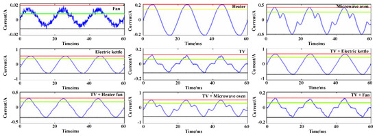 The eigenvalues obtained from the steady-state load current include the peak value, standard deviation (SD), root mean square (RMS) value, and the number of wave peaks (valleys). These eigenvalues can be used as the load signature (LS) characteristics and provide a vital basis for load identification. Waveform and eigenvalues from the steady-state load current of some types of home appliance equipment are shown in Figure 3 (the red line is the wave peak, the black line is the wave trough, the green line is the RMS, and the yellow line is the SD). Table 1 shows the characteristic values of each load.