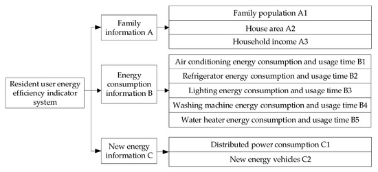 A residential user’s energy efficiency index system based on factors affecting user energy efficiency is established in this paper, and it is divided into three types of first-grade indexes: household information, energy consumption information, and new energy information. As shown in Figure 4, the secondary indicators contain more detailed metrics that can be set based on different geographical variables and the characteristics of the user.