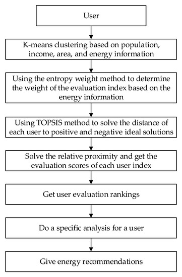 Based on the above, a flowchart of the energy efficiency evaluation for residential users as shown in Figure 5 is obtained. Users are classified according to user features and non-invasive information, and comprehensively evaluated by the TOPSIS method. The weight of each index in the energy consumption information and the new energy information is determined by the entropy weight method. A specific analysis of the user should be given based on the assessment results. Through the horizontal and vertical standard, the potential energy-use problems of the household should be analyzed, and energy-use suggestions should be given.