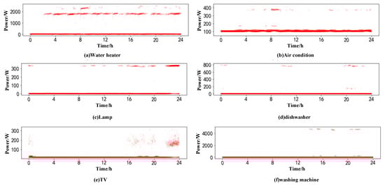 Active power and reactive power are the most commonly used steady-state electrical characteristics in non-invasive load decomposition. To some extent, the usage of load can reflect the user’s electricity consumption behavior, while the probability distribution of the load’s state behavior can provide key characteristic information. In Figure 6, the active power scatter diagram is drawn according to the obtained data of six typical loads for two weeks, with a period of 24 h to show the electrical characteristics and behavior rules of each load. The darker the scatter color, the greater the number of superimposed data points.