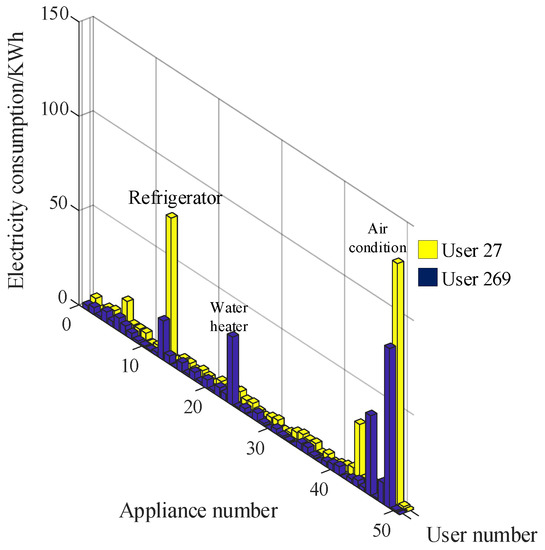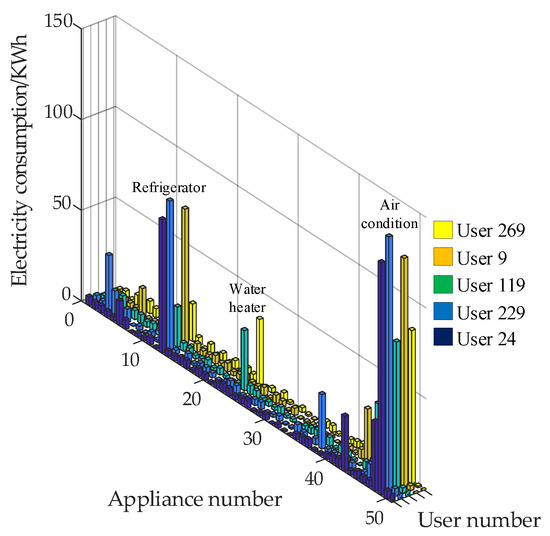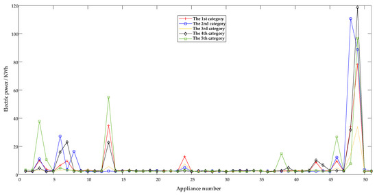 On the whole, the distribution of energy used by various electrical appliances among different types of users is roughly the same. Among them, the energy used by user 119 is significantly lower than that of other users, and the energy consumption of the electrical appliances increases slightly. The energy usage of user 269 is similar to that of the other users, but the clustering results are different due to population, area, and income; so, user 269 has a high score among all the users. Compared with user 269 and user 119, users 24, 229, and 9 consume more energy for electric appliance No. 13 (refrigerator) and electric appliance No. 49 (air conditioner). Therefore, it should be further investigated whether the users’ appliances have a standby mode or if users are leaving lights on in unoccupied rooms. In addition, some households do not consume energy for electric appliance No. 24 (water heater); so, it can be inferred that these households likely use natural gas rather than electricity to generate hot water.