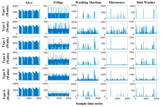 All the electricity consumption data used in this paper were provided by NILM equipment, so the sampling period was 15 min. The user’s personal information was filled in and entered into the database by the user, which was mainly stored and analyzed in Excel. In the experiment data, 51 types of electrical household appliances commonly used in the home were included, such as air conditioners, refrigerators, televisions, water heaters, and washing machines. The names of the appliances are listed in Appendix A.