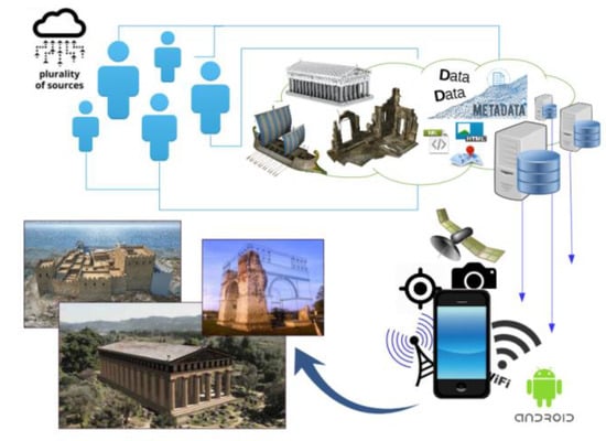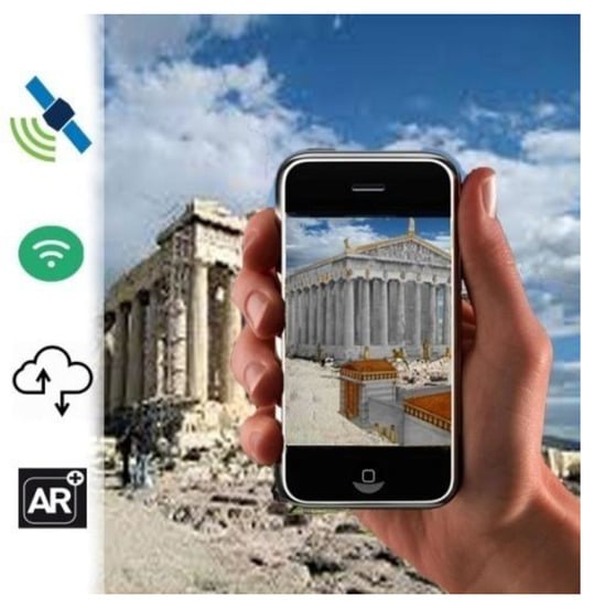 In a hypothetical scenario, the visitor of the monument opens the mobile camera and aims at a point of interest. Through a free application and a set of data made available by the wireless infrastructure of the archaeological site or the Internet, the cultural tourists can visualize and acquire, according to their wishes, in-depth information regarding the archaeological site, the monuments or historical events pertinent to them, enhancing, that way, their cultural experience. At the same time, the Global Positioning System (GPS) receiver of the smart device will accurately approximate the visitor’s position within the 3D virtual geospatial world. Alternatively, the visitor may be able to make use of the virtual content remotely without having to visit the site and receive information about the cultural product of the area of interest (Figure 1).