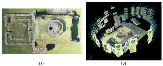 Photogrammetry is the method of dimensioning and extracting high-precision metering data using photographs. As a method, it requires a systematic image capture of the objects, in order to produce 3D models of them. The systematicity of image capturing lies in the necessity of collecting photos with significant overlapping so that each object appears in more than three images. Modern photogrammetry specifies a minimum overlapping percentage of 75% on each image []. However, the accuracy of metering data depends not only on the systematic collection of photographs, but also on other factors, such as (1) internal orientation, which in modern digital cameras is described by (a) the physical size of the sensor; (b) the number of sensor pixels (resolution); (c) the distance of the sensor from the lens’s center of focus; (d) the lens’s focal length in mm; and (2) the outer orientation of each shot described by the physical location of the camera collecting photographs.