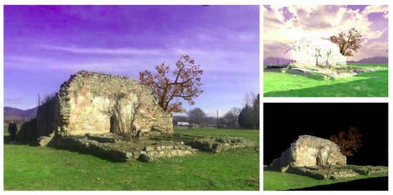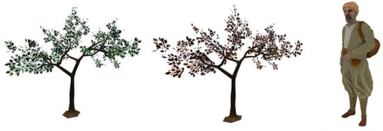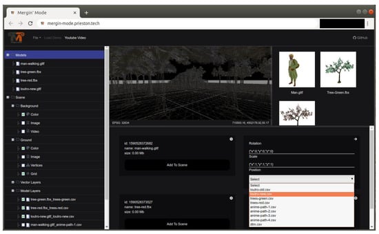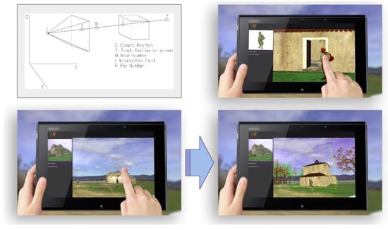 - The authorities responsible for promoting specific cultural-touristic resources may exploit the portion of the system dealing with the development of the digital material. “Mergin’ Mode” authoring tool utilizes geographic information systems (GIS)-based functionalities to assist the development of virtual custom geospatial worlds presenting historical representations of the monuments. Beyond the typical thematic layers that may include the site terrain and vector graphics with areas, lines and points, additional themes may be added to compose sophisticated 3D scenes []. Such themes may include 3D models of natural spatial objects (e.g., trees or plants) or of cultural objects of historical importance either moveable (e.g., amphorae) and immovable (e.g., temples) or “living” ones (e.g., people and animals). Other thematic layers may specify the routes of motion for moving objects, or the points/areas of placement for the stable ones. Although the overlaying of numerous thematic layers to form a photorealistic 3D scene is a relatively old technique, since the era of the first multimedia projects, such as Flash [], the geospatial reference of all the involved objects nevertheless requires a GIS-based approach. Besides, the spatial reference is the key property of an object that specifies its behavior in response with the end-user location. Moreover, although virtual reality and 3D computer graphics technologies have evolved over the last decades, their co-existence with LBS is an issue that invites further research and development projects.