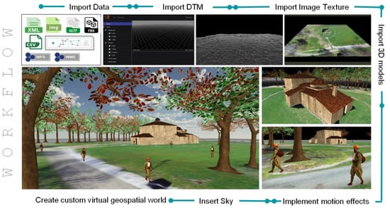 In recent years there has been a widespread penetration of location-based services (LBS), also known as geo-services, into people’s daily activities, triggered by the increasing affordability of smart devices (tablets, mobile phones) for the average end-user/consumer []. A typical example of using geo-services is the navigation to a place using freely available maps and the simultaneous association of current location with other complementary information. At the same time, significant developments in geoinformatics technologies reflect the progress occurred in hardware and software technologies. Nowadays, it is possible to map a region with high topographical accuracy and create high-resolution digital terrain/surface models (DTM/DSM) by employing unmanned aerial vehicles (UAV) [,,]. Likewise, new technologies allow the creation of three-dimensional models that simulate inanimate or moving/animated spatial objects (e.g., buildings or virtual humans respectively) []. The above, combined with high quality three-dimensional (3D) modeling visualization and animation capabilities offered by computer graphics technologies, enable the development of custom virtual geospatial worlds. A custom virtual geospatial world simulates real-world spatial objects in a number of overlaid geo-referenced thematic layers []. These layers may include raster surface textures, DTM/DSM models and 3D spatial entity models moving in pre-specified or dynamically defined motion paths. The implementation of such virtual worlds can be based on open technologies and standards and on functionalities provided by free software libraries. Moreover, they can be demonstrated on smart device platforms and/or standard interfaces of the World Wide Web. The ever increasing data transfer speed in communications and wireless networks [], the widespread use of geospatial web services [] and the evolution in the augmented reality (AR) technologies [] are boosting the provision of custom virtual geospatial worlds for a mobile end-user and offer novel opportunities for the deployment of numerous smart applications (apps).