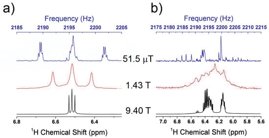 Comparison of the 1H spectra for 1,4-difluorobenzene (a) and 1,2,4-trifluorobenzene (b) using a superconducting high magnetic field (9.4 T, black), a permanent high magnetic field (1.43 T, red), and permanent low field magnetic field (51.5 µT, blue). The high field spectra are plotted on a chemical shift axis (bottom scale) and the low field spectrum is plotted on a frequency axis (top scale). As the field is decreased, in the high field regime, there is significant overlap of the peaks, which becomes problematic when multiple chemical shifts are present (b). The low field NMR spectrum has additional peaks in the spectrum that are not captured by either high field spectrum, and also provides fewer overlapping resonances in the case of the 1,2,4-trifluorobenzene (b).