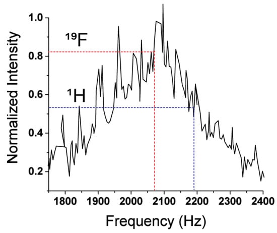 All acquired JCS were zero-filled and Fourier transformed without apodization. Each spectrum was then shifted according to the frequency-adjusted averaging method previously described before summation [32]. Zero and first order phase corrections were applied with a baseline correction to each portion of the spectrum. Simulations of the expected JCS of each compound were carried out in MATLAB (2019a, Mathworks, Natick, MA, USA, 2019) using the SPINACH software library (v2.4.5157 SpinDynamics, Southhampton, UK, 2019) [51]. The SPINACH simulations used a scalar coupling connectivity model, spherical tensor Liouville space formalism (sphten-liov), and an IK-2 approximation for spin correlations. The simulation assumed all 1H and 19F nuclei to be spin-active with no effects from natural abundance 13C. Chemical shifts were also included in the simulations, and those values were obtained from high field measurements. The simulated FIDs were modeled using the same experimental conditions in which the JCS were acquired using a dwell time of 100 µs and 50 k points. The experimental spectra were collected using a tuned resonant circuit, which preferentially enhances certain frequencies. The instrument response of the tuned circuit without a sample is shown in Figure 2 and demonstrates that the 19F response was ≈1.5x larger than the 1H response. Therefore, the 19F spectra were first normalized by a factor of 1.5 and then the entire JCS (both 19F and 1H) regions were normalized to the highest intensity peak. The best fits were obtained using a nonlinear least square fit set to minimize the R-factor, which is defined as