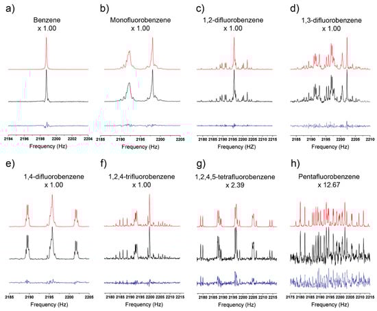 The 1H region of the JCS for benzene (a), monofluorobenzene (b), 1,2-difluorobenzene (c), 1,3-difluorobenzene (d), 1,4-difluorobenzene (e), 1,2,4-trifluorobenzene (f), 1,2,4,5-tetrafluorobenzene (g), and pentafluorobenzene (h). The black lines are the experimentally measured spectra, the red lines are the simulated spectra, and the blue lines are the residuals between the experimental and simulated spectra. Each spectrum also has a scaling factor, which is denoted below the compound name, indicating the amount the experimental, simulated, and residuals that were multiplied such that the maximum peak intensities of the experimental spectra (a–h) were equivalent.