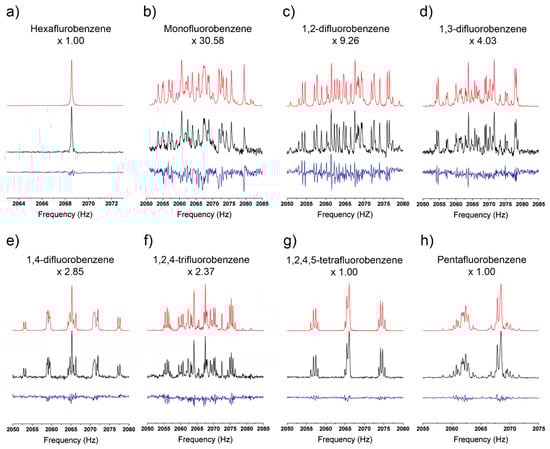 The 19F region of the JCS for hexafluorobenzene (a), monofluorobenzene (b), 1,2-difluorobenzene, 1,3-difluorobenzene (c), 1,4-difluorobenzene (d), 1,2,4-trifluorobenzene (e), 1,2,4,5-tetrafluorobenzene (g), and pentafluorobenzene (h). The black lines are the experimentally measured spectra, the red lines are the simulated spectra, and the blue lines are the residuals between the experimental and simulated spectra. Each spectrum also has a scaling factor, denoted below the compound name, that indicates the amount the experimental, simulated, and residual data was multiplied such that the maximum peak intensities of spectra (a–h) were equivalent.