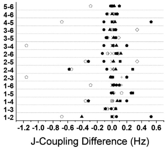 Differences in the J-couplings between the JCS and the literature values reported in [44] and [45]. The symbols correspond to different compounds (● monofluorobenzene, + 1,2 difluorobenzene, × 1,3-difluorobenzene, ◇ 1,4- difluorobenzene, ▲ 1,2,4- trifluorobenzene, ■ 1,2,4,5-tetrafluorobenzene, and ⬟ and ⌂ for pentafluorobenzene). The values on the y-axis correspond to the coupled positions on the benzene ring.