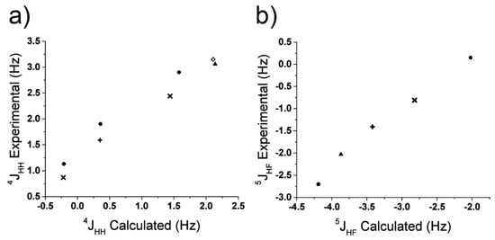 Comparison between experimentally determined and ab initio calculated 4JHH (a) and 5JHF (b). The symbols correspond to different compounds (● monofluorobenzene, + 1,2 difluorobenzene, × 1,3-difluorobenzene, ◇ for 1,4 difluorobenzene, ▲ 1,2,4- trifluorobenzene, ⬟ for pentafluorobenzene). A linear dependence was observed for both datasets, which indicates that the opposite relative sign obtained from ab initio calculations is due to the known scaling issues for these calculations. Therefore, when calculated or experimental J-couplings are near zero, a sign error may result; however, this is remedied by applying a linear correction factor.