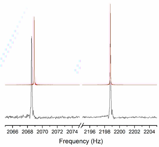 Impact of chemical shift on the simulated spectrum of a hexafluorobenzene + benzene mixture (1:1). The red spectrum is the simulated spectrum assuming 19F δiso = 0 ppm. The black spectrum is the experimentally acquired JCS, which was well fitted in simulations with a δiso = −163.2 ppm (Figure 3a). The hexafluorobenzene chemical shift at these microtesla (μT) fields is a discernable shift of approximately −0.34 Hz.