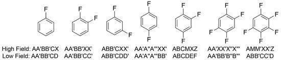 In addition to distinct quantitative data, each compound also had a unique JCS signature in both 1H and 19F regions caused by strong heteronuclear J-coupling. Due to differences in the J-couplings for each molecule, each spectrum was a unique spectral fingerprint or signature. While it is tedious to describe every spectrum on the basis of the observed J-couplings, it is illustrative to describe several of the spectra and the spectral features associated with the phenomena that occur at LF [21,25,27,32]. Each spin system can be described in a reduced form using Pople notation [60,61]. In Pople notation, nuclei that are chemically inequivalent are denoted by a letter (A, M, X…etc.) and nuclei that are weakly coupled, such as heteronuclei at high field, are denoted by letters far from each other such as AX for an H-F spin system. Nuclei that are strongly coupled are denoted by adjacent letters, such as AB for two strongly coupled protons. Finally, nuclei that are chemically equivalent, but magnetically inequivalent, are given a prime notation (’). For example, monofluorobenzene at high field would be described in Pople notation as an AA’BB’CX system, where the protons in the 2,6 and 3,5 positions are chemically equivalent, but magnetically inequivalent. Here, all three sets of protons are strongly coupled to each other due to minute chemical shift differences. The spectrum of each NMR active nucleus then consists of several subspectra, which stem from both the strong and weak J-couplings for each chemically inequivalent environment. For example, consider the 1H JCS of 1,4-difluorobenzene (Figure 1a and Figure 3d). The spectrum consists of three unique subspectra at 2189 Hz, 2196 Hz, and 2202 Hz. The Pople notation for each system will change at LF since the A and X nuclei are strongly coupled. Therefore, monofluorobenzene at LF has a Pople notation of AA´BB´CD. Both the high field and LF Pople notations are given for each fluorobenzene molecule in Figure 8. At LF, monofluorobenzene and pentafluorobenzene have equivalent Pople notations, as does 1,4-difluorobenzene and 1,2,4,5-tetrafluorobenzene. Therefore, it is expected that these compounds will have similar subspectra, albeit with the subspectra centered at the opposite Larmor frequency. For example, the 1H region of monofluorobenzene and the 19F spectrum of pentafluorobenzene consists of two subspectra separated by ≈5 Hz (Figure 3 and Figure 4). For 1,4-difluororbenzene, the 1H region has three unique subspectra, while the 19F region has five distinct subspectra. This is equivalent to the number of subspectra in the 19F and 1H regions of 1,2,4,5-tetrafluorobenzene, respectively (Figure 3 and Figure 4). Of course, just as the heteronuclear and homonuclear J-couplings are different between the molecules with the same Pople notation, the absolute spacing and peak intensities of the subspectra are unique for each molecule.