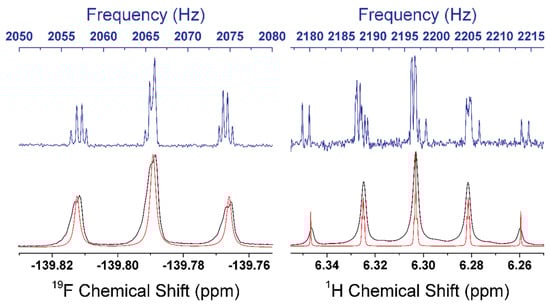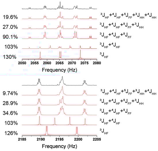 Each subspectrum is governed by the heteronuclear and homonuclear J-couplings, the impact of which is shown in Figure 9 for 1,4-difluorobezene. In this figure, the J-couplings were successively added into the simulation from largest to smallest, beginning with heteronuclear couplings and ending with homonuclear couplings. The R-factors for the 19F and 1H portions of the spectra are provided on the side of each spectrum, and each additional J-coupling parameter is denoted between each spectrum. As is evident from Figure 9, if only the heteronuclear couplings 3JHF and 4JHF were considered, a poor simulation of the experimental spectrum is obtained. However, once 5JFF is added, the spectra are split into the correct subspectra. Here, 19F has five subspectra regions, while 1H has three subspectra regions. Addition of the JHH then refined the positions and intensities within each subspectra. It is interesting to note that 5JFF > |3JHF − 4JHF| (17.65 Hz > 3.93 Hz) and this observation disagrees with that proposed by Appelt et al. (Equation (2)), and indicates that homonuclear J-couplings are measurable as long as the magnetic equivalence between the homonuclear spins is broken by a heteronuclear J-coupling to either of the nuclei [16].