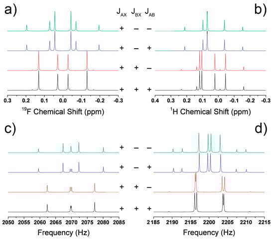 Here, m is the sum of the spins of all X nuclei, and m can have values of ±1/2. In this system, only the relative signs of JAX and JBX can be established, since Cm depends on the value (JAX−JBX). On the other hand, the JAB term is always squared and will have the same relation to JAX and JAB, regardless of the relative sign of JAB. At LF, the same ABX system assumes one or both A and B are in the strongly coupled heteronuclear regime, which transforms into an equivalent ABC system. As was demonstrated by Alexander, the relative signs of the ABC system can be determined [63]. In this spin system, 15 transitions are theoretically observable, although only 12 to 14 are typically reported in the literature [63,64]. To illustrate this point, the JCS and high field spectra were simulated for the ABX (C) system in which spins AB were strongly coupled at high field and spins ABC were strongly coupled at LF (Figure 10). Each spectrum was simulated with three J-couplings (JAB, JAX, and JBX), whose relative signs were changed between each simulation. There are four unique sign combinations for these systems. As Figure 10 demonstrates, at high field (Figure 10a,b), only the relative signs of JAX and JBX may be determined, as the black (+ + +) and red (+ + −) spectra are equivalent, as were the blue (+ − +) and green (+ − −) spectra. However, at LF (Figure 10c,d), all three signs may be determined, as each spectrum is distinct for each sign combination. Therefore, for the same molecule analyzed at high field and LF, the LF spectrum allows determination of the relative signs for all coupled nuclei as long as the total spin system contains more than two spins, whereas coupling sign determination at high field requires a strong homonuclear J-coupling.