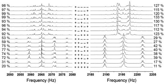 The 16 different possible sign permutations of the 5 J-couplings measured for the JCS of 1,4-difluorobenzene. The absolute signs are denoted between the 19F (left) and 1H spectra (right). The same spectra were obtained when there were degenerative, same relative sign combinations (e.g., + + + + + is equivalent to − − − − −). The signs from left to right correspond to absolute signs of 3JHF, 4JHF, 5JFF, 3JHH, and 4JHH, respectively.