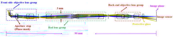 Designed model of optical endoscope. The length and diameter of optical endoscope are 90 mm and 3 mm, respectively. The effective focal length (), the diameter of entrance pupil (), the diameter of aperture stop () and objective distance () are 3.21 mm, 0.35 mm, 0.836 mm and 2 mm, respectively. The phase mask will be placed at the aperture stop when aiming at extending the depth of field (DOF).