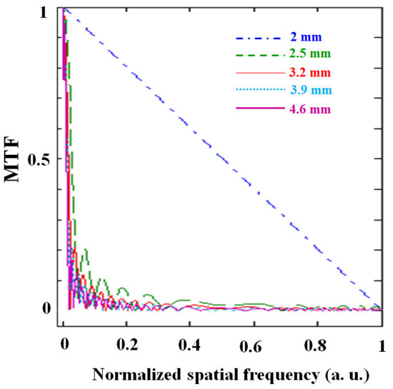 Calculated modulation transfer function (MTF) curves of initial optical endoscope (from Equation (9)) varied with object distances. The blue dotted-dashed line, green dashed line, red thin line, blue dotted line and purple thick line represent the object distances of 2 mm, 2.5 mm, 3.2 mm, 3.9 mm and 4.6 mm. The normalization factor, also referred as maximum spatial frequency, depends on the diameter of Airy disk of the optical system, which can be defined as . According to the parameters of diameter of entrance pupil = 0.836 mm, objective distance = 2 mm and m, the calculated normalization factor is 146 lp/mm.