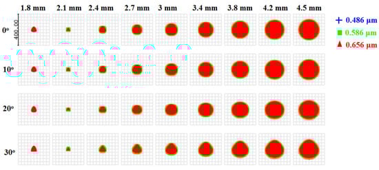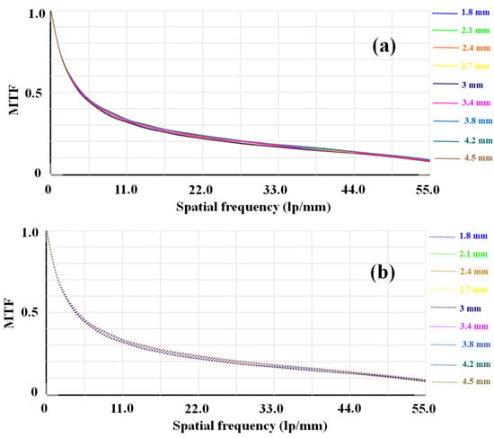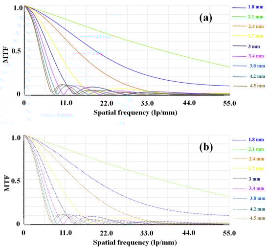 The simulated results of MTF curves acquired by Zemax both in tangential and sagittal directions are shown in Figure 8a,b, respectively. All the curves stay invariant with objective distance ranging from 1.8 to 4.5 mm. The spot diagrams with wavefront coding technique in various objective distances and FOVs are described in Figure 9, which reflects a comprehensive view of how an image forms on the image sensor. We find that all the spots on the image sensor keep same style and size. The features of MTFs and spot diagrams in the new system bring a lot of benefits to acquiring and restoring the high-quality images with extended DOF.