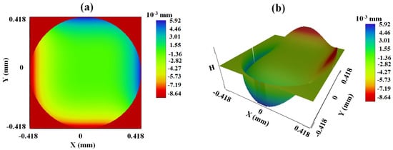 where represents the with defocus value at different horizontal spatial frequency and vertical spatial frequency , and represents the with different horizontal spatial frequency and vertical spatial frequency at the focal plane. After selecting 100 different defocus values between and maximum defocus value, each difference between and is calculated and recorded. After the optimization by above criteria in Zemax, the parameters of mm, A = −0.00579, B = 0.033274 and C = 0.13038 are obtained. The structure of the proposed phase mask is depicted in Figure 5.