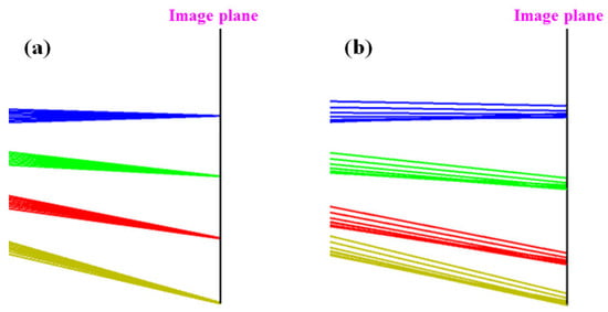 Under the manipulation of phase mask, the light ray, propagating between the optical lenses, has been modified from focusing state at a special point (Figure 6a) to defocusing state in a certain range (Figure 6b). The phase mask is constructed to avoid the presence of zeros in the corresponding MTF curves and calculus errors in the recovery procedure. Figure 7 exhibits the MTF curves calculated by Equation (9) in Matlab software, and the curves almost overlap when varying the objective distances. Most importantly, the zero points appearing in the initial system vanished with the help of the phase mask, which indicates all the spatial information is reserved in the wavefront coding system.