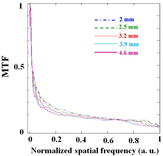 Calculated MTF curves of optical endoscope with phase mask (from Equations (9) and (11)), varied with object distances. The blue dotted-dashed line, green dashed line, red thin line, blue dotted line and purple thick line represent the object distances of 2 mm, 2.5 mm, 3.2 mm, 3.9 mm and 4.6 mm. The normalization factor, also referred as maximum spatial frequency, depends on the diameter of Airy disk of the optical system, which can be defined as . According to the parameters of diameter of entrance pupil = 0.836 mm, objective distance = 2 mm and m, the calculated normalization factor is 146 lp/mm.