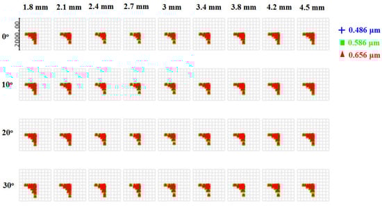 Spot diagrams of initial optical endoscope, varied by different object distances and FOVs. Each column stands for the same object distance (e.g., 1.8 mm), and each line stands for the same FOV (e.g., 0). The blue cross, green square and red triangle represent the 0.486 m, 0.586 m and 0.656 m incident light.