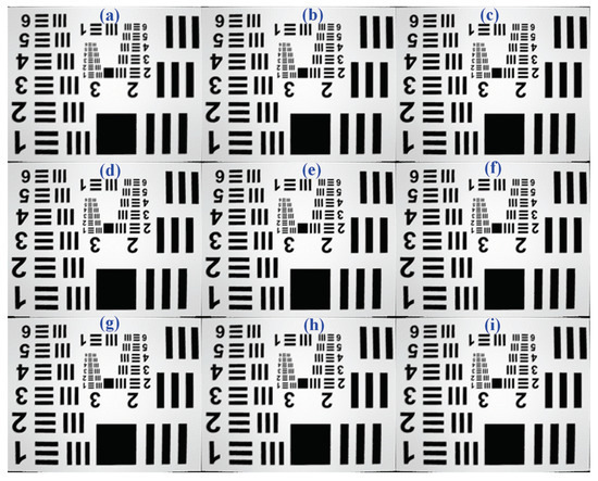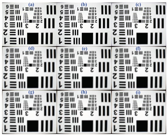 Imaging results of wavefront-coded optical endoscope in different objective distances. (a) 1.8 mm. (b) 2.1 mm. (c) 2.4 mm. (d) 2.7 mm. (e) 3 mm. (f) 3.4 mm. (g) 3.8 mm. (h) 4.2 mm. (i) 4.5 mm.