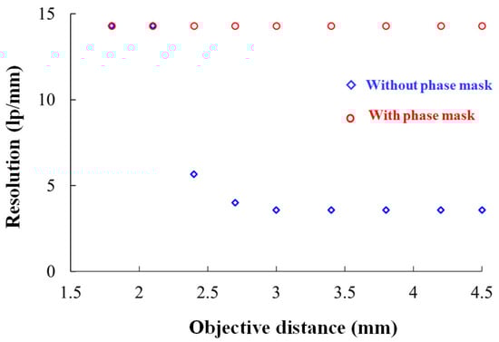 In addition, the Imatest software, focused on image quality, is used to test the accurate spatial resolutions of captured pictures in our imaging system. It ensured that we could acquire consistent testing results throughout the whole experiment. As shown in Figure 12, the spatial resolution of pictures collected by original optical model drops rapidly to 3.58 lp/mm, when the objective distance is away from the designed value. Meanwhile, the resolution of pictures from optical model with phase mask stays at 14.3 lp/mm, in which objective distance ranges from 1.8 to 4.5 mm. Therefore, we may reasonably reach the conclusion that the DOF has been extended from to 0.3 mm to 2.7 mm with the usage of wavefront coding technique.