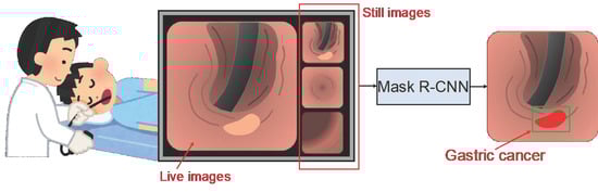 In endoscopy, a physician collects still images at important locations while observing the patient’s esophagus, stomach, and duodenum in order. In this study, we developed a method to perform automated detection and extraction of the gastric cancer region using Mask R-CNN (Figure 1). This study was approved by an institutional review board, and patients’ informed consent was obtained under the condition that all data were anonymized (No. HM17-226).