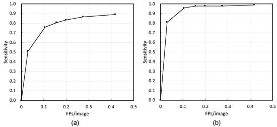 Free-response receiver operator characteristics (FROC) curves of (a) image-based evaluation and (b) lesion-based evaluation.