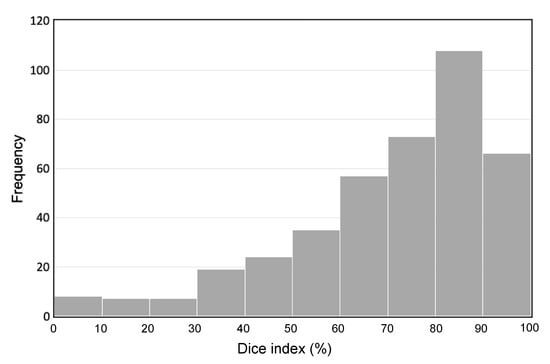 Regarding the segmentation accuracy of the invasive region of gastric cancer, the histogram of the Dice index is shown in Figure 5. Based on this histogram, the average Dice index was 72.0%. As a result of extracting the gastric cancer region using U-Net, the average Dice and Jaccard coefficients were 57% and 43%, respectively.