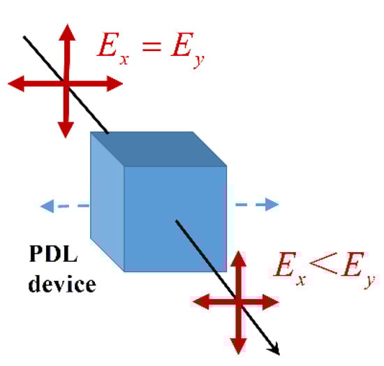 PDL mainly comes from optical devices, which refers to the polarization-dependent attenuation of optical power to input signals. As shown in Figure 1, when a PDM signal passes through an optical component that has a pair of orthogonal high- and low-loss eigenmodes, the two polarizations Ex and Ey are transmitted along the high-loss eigen-mode and the low-loss eigen-mode, respectively; therefore, their losses are different, and the output power of the two orthogonal polarizations are also different. The PDL matrix can be expressed as
