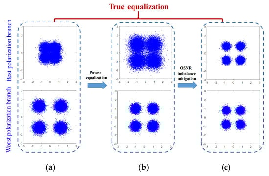 Schematic representation of PDL equalization: (a) The signal suffers PDL; (b) after power equalization; (c) after bit-error-rate (BER) recovery coming from optical signal-to-noise ratio (OSNR) imbalance.