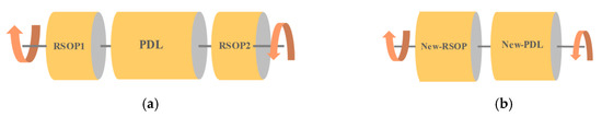 When PDL and RSOP coexist in the form of the generally adopted model of RSOP1 + PDL + RSOP2, as shown in Figure 3a, a decoupling model is needed for simplicity. We rewrite Equation (3) and finally obtain Equation (4).