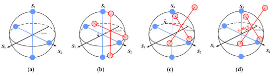which means that when a power imbalance between the two polarization tributaries exists, the center of gravity of the constellation will shift from the origin (denoted as ), as shown in Figure 4b. When the signals suffer from both RSOP and PDL, the power inequality induced by PDL will cause a shift in the center of gravity of the constellation in Stokes space from the origin point of the Poincaré sphere, and the RSOP will cause a decline in the constellation structure, as shown in Figure 4c. In this case, we can move and then the entire constellation structure by the three steps of rotations and shifting until this returns to the original position. This procedure of balancing the PDL-induced power inequality is shown in Figure 4d.