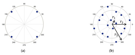 - The choice of measurement vector is based on the location of the ideal constellation points after compensation. As for the Golden-coded QPSK signal, the ideal constellation points are located at three rings with the radii r1, r2, and r3, as shown in Figure 5b. Thus, we design as:where and represent the equalized signal and its complex conjugate. Therefore, we choose the innovation as:where is the zero matrix, which means the ideally equalized PDM signal’s constellation points located on the three radii of the three circles on two x- and y-polarization constellation planes.