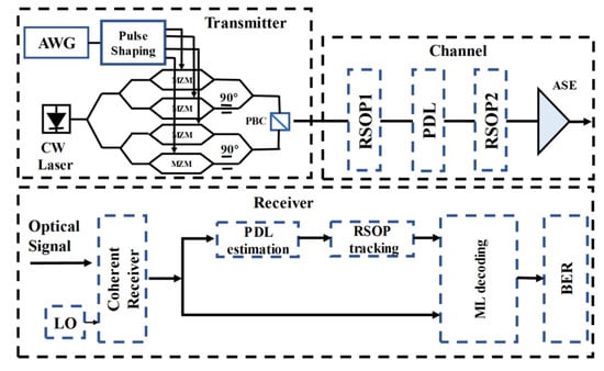 In fact, the OSNR asymmetry in optical communication is similar to frequency-selective fading in multi-antenna wireless channels, which can be mitigated by space–time (ST) codes. The idea can be carried over and employed. In 2010, Mumtaz et al. first introduced these codes in PDM systems for PDL mitigation and renamed it to polarization-time code (PTC), which has been proven to be very effective to truly mitigate PDL [10,11,12,13]. In their works, they supposed having perfect channel state information, or used a training sequence (TS) to estimate the channel matrix prior to implementation of the polarization-time (PT) decode at the receiver. However, there is no channel state information at the receiver. In addition, for the single-carrier systems, we prefer a blind equalizer adopted before the PT decoder at the receiver. Furthermore, in some extreme environments, like violent vibrations when trains pass by and lightning strikes on rainy days, an ultra-fast rotation of state of polarization (RSOP) would be induced with a rate of mega-radian per second [14,15,16,17]. The fast RSOP in combination with large PDL will make the eigenmodes of the PDL randomly time-varying, putting a heavy burden on the DSP equalizer.