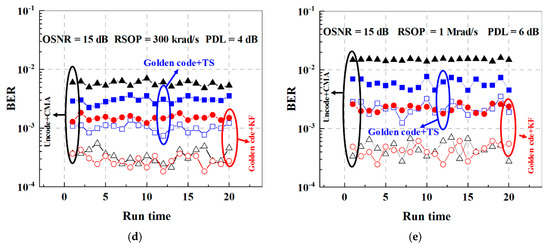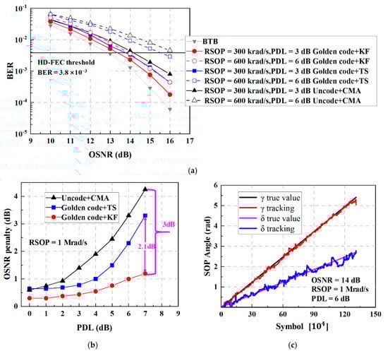 Figure 7 depicts the performance of the proposed Golden code and Kalman filter equalization method (marked as Golden code + KF). For references, we also simulate the following two methods: The first one is an uncoded signal at the transmitter with constant modulus algorithm (CMA) equalization at the receiver (marked as Uncode + CMA); and the second is a golden-coded signal at the transmitter with training sequence (TS)-assisted RSOP tracking at the receiver (marked as Golden code + TS). The idea for the TS-assisted RSOP tracking scheme is based on the assumption that the TS and the entire data block have suffered from the same RSOP. Hence, the RSOP tracking ability of TS depends on how frequent TS is inserted in the data block. Obviously, the more frequent the TS that is inserted, the more redundancy there will be. In this paper, we design to insert 10 TSs in every 400 symbols, which means 2.5% of the redundancy. Figure 7a illustrates the BER depending on the OSNR with different PDLs and speeds of variation of RSOP. We can see that using the hard decision forward-error correction (HD-FEC) threshold (BER = 3.8 × 10−3) as the criterion [30,31,32], the Golden code + KF method exhibits an apparently better performance than those of the uncode + CMA and Golden code + TS schemes under different conditions of RSOP from 300 to 600 krad/s and PDL from 3 to 6 dB. In Figure 7b, we discuss the PDL-induced OSNR penalty at BER = 3.8 × 10−3 under the severe impairment environment of RSOP = 1 Mrad/s. Thanks to the coding gain brought by the Golden code and the excellent RSOP tracking ability of the Kalman filter, at PDL up to 7 dB, the proposed Golden code + KF scheme only needs an OSNR penalty of approximately 1.2 dB. It is worth mentioning that the proposed method wins 3 dB OSNR than the uncode + CMA scheme, and 2.1 dB OSNR than the Golden code + TS scheme. Therefore, it is obvious that the Golden code + KF method has an overwhelming advantage over the other two methods. At the same time, RSOP tracing performance of the proposed Golden code + KF method is also shown in Figure 7c. The polarization impairment is assumed to be 1 Mrad/s RSOP and 6 dB PDL under 14 dB OSNR. In Figure 7c, the black line and the red line represent the true value and tracking value of γ, respectively, and the pink line and the black line represent the true value and tracking value of δ, respectively. We can see that the RSOP tracking curve converges quickly, and the tracking results of rotation angles γ and δ agree well with the original linearly increased ones, which means the proposed Golden code + KF method is indeed effective to track ultra-fast RSOP. In Figure 7a,b, we discuss the average BER on the worst and the best polarization cases. Now, we study the worst and the best BERs of the PDM signal separately. The results are shown in Figure 7d,e (the solid point is the worst polarization case and the dashed point is the best polarization case). We study both the weak impairment condition (RSOP = 300 krad/s, PDL = 4 dB, and OSNR = 15 dB), as shown in Figure 7d, and the severe impairment condition (RSOP = 1 Mrad/s, PDL = 6 dB, and OSNR = 15 dB), as shown in Figure 7e. We can see that the proposed Golden code + KF method can effectively mitigate the different BERs of the two polarization branches in both weak and extreme scenarios.