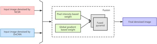 The proposed denoising effect boosting method is a linear combination of NCSR and DnCNN. That is, we apply two denoisers and to yield two denoised images and . We compute the desired image by retaining only the “optimal” parts in images and . This process is guided by the relative pixel intensity and the global gradient, which are consolidated into a scalar-valued weight map. The final image is obtained by fusing and using weighted blending. The processes involved in the proposed method are shown in Figure 3.