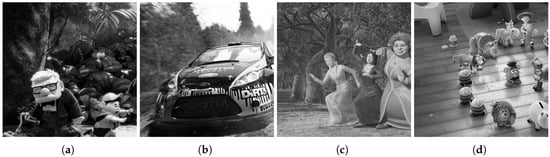 Referring to the two widely used test datasets and the ESPL synthetic image database [], we derived our test images to evaluate the denoising performance of the proposed method and that of several competing methods. The first datasets contains ten natural images that are commonly used to study image denoising, including four images with a size of (, , and ), and six images with a size of (, , , , , and ), as shown in Figure 4. The second one is a set of 50 natural images selected from the Berkeley segmentation dataset (BSD) []. The third dataset contains 25 high quality synthetic color images obtained from the Internet, which generally comprised 1920 × 1080 pixels. The images are primarily selected from some popular animation movies and video games. All of the images contain both repetitive patterns and irregular textures. Some examples can be seen in Figure 5.