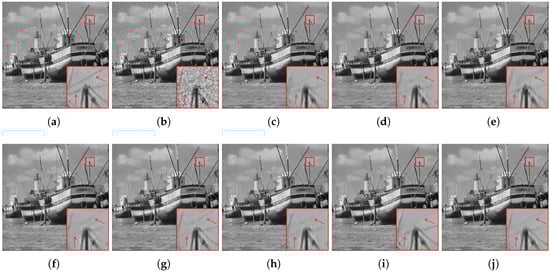 As the ultimate judges of image quality are human subjects, visual quality is also critical in evaluating a denoising method. Therefore, we focus on the visual comparison of the images denoised by the eight competing methods in this study. The results of the experiment at the noise level for the test image , shown in Figure 6, illustrate that the proposed method can preserve the contrast and structural details almost entirely. Comparing our method with other methods, it can be observed that the results of the NCSR and PGPD have lost several image details, whereas BM3D, WNNM, DnCNN, and TWSC produced over-smoothed results in the highlighted red window. Furthermore, FFDNet tends to generate several artifacts on the sign of the boat, where the proposed method obtains a smooth result. Particularly, the proposed method can recover well the thin masts of the boat. These masts are almost absent in the recovered images obtained by other methods.