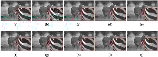 In addition, we test our method on the BSD dataset. It is clear from the results that the proposed method exhibits a visual performance that is superior to that of the other denoising methods. Visual comparisons of the results obtained using the various denoising methods are shown in Figure 8. It can be seen that NCSR generates substantial artifacts between the zebra’s stripes, and DnCNN balances the contrast well; nevertheless, it tends to distort the lines and generate blurred edges. It is not surprising that our method can preserve much more sharp edges and fine details because it is a combination of NCSR and DnCNN via the proposed fusion strategy, which is highly promising.