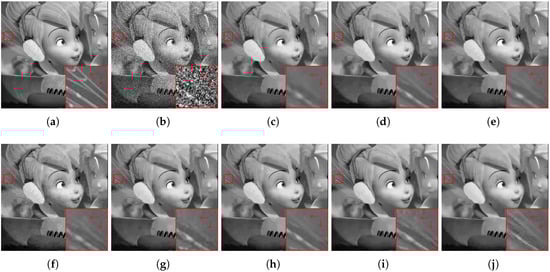 Comparison of denoising results of the competing methods for the test image with noise level . (a) Original image. (b) Noisy image. (c) NCSR, PSNR = 26.73 dB. (d) WNNM, PSNR = 27.46 dB. (e) PGPD, PSNR = 27.03 dB. (f) BM3D, PSNR = 26.55 dB. (g) DnCNN, PSNR = 27.85 dB. (h) TWSC, PSNR = 27.44 dB. (i) FFDNet, PSNR = 27.82 dB. (j) Proposed, PSNR = dB.