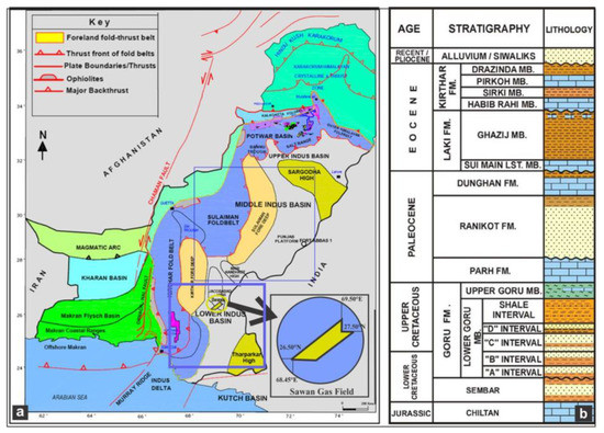 (a) Regional geological map showing the structural settings, tectonics, and local multiple sedimentary basins of Pakistan. The Sawan gas field is located near Jacobabad-Khairpur Highs towards the junction of the Middle and Lower Indus Basin (highlighted by blue squares); (b) generalized stratigraphy of the study area (lower Indus Basin).